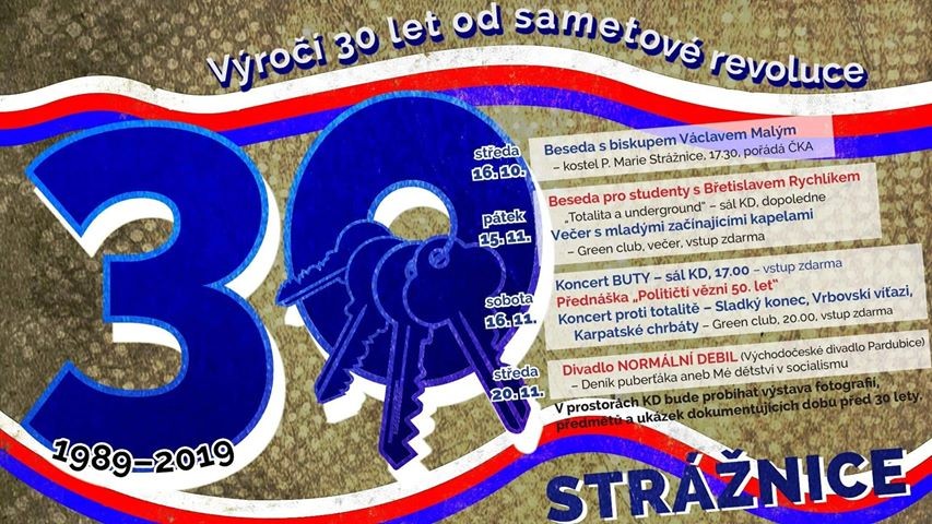 16. 11. 2019 od 17:00 vystoupí v sále kulturního domu kapela BUTY, po té proběhne přednáška s názvem „Političtí vězni 50. let“ a od 20:00 se v Green clubu koná Koncert proti totalitě