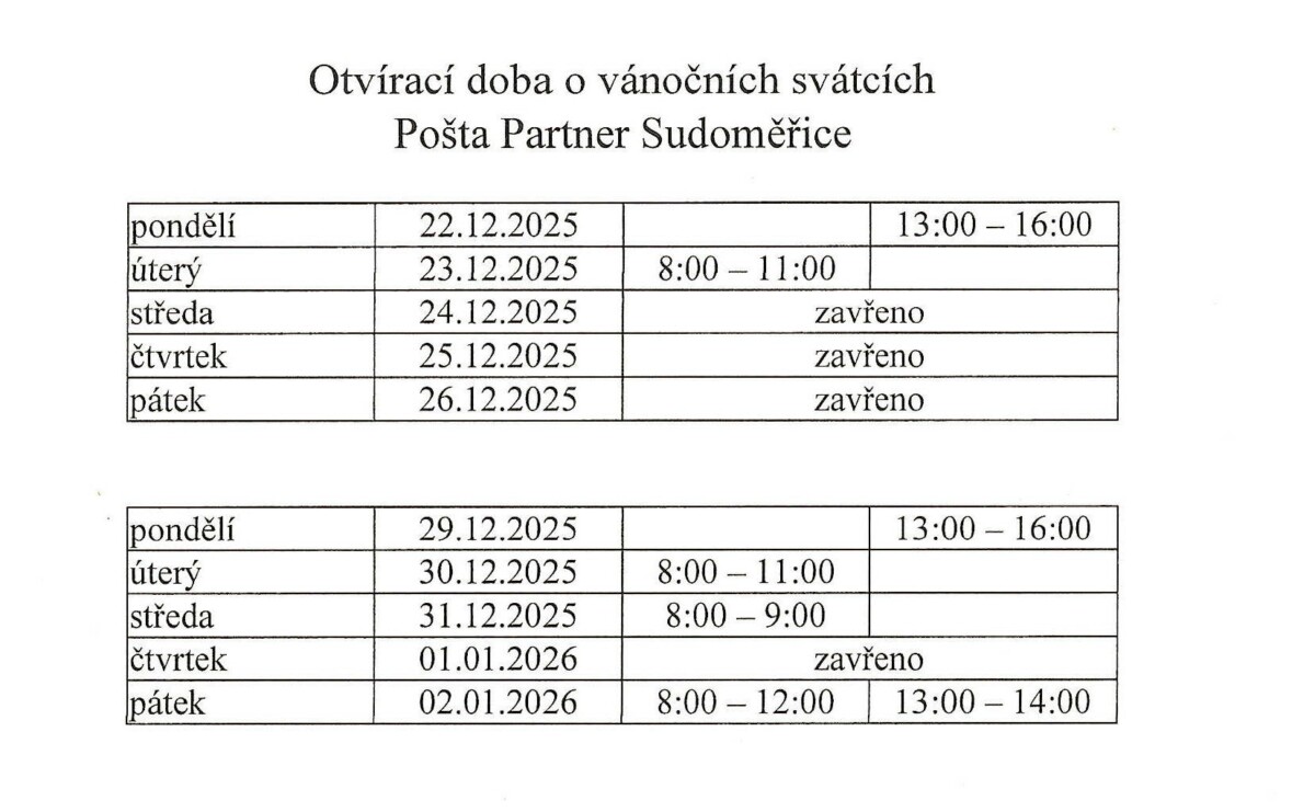 níže naleznete upravenou vánoční otevírací dobu Pošty Partner v Sudoměřicích.